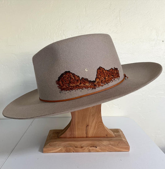 These landscapes are embroidered free hand directly onto the hat to both accurately depict the landscape requested by you and to evoke emotion through my technique and style.