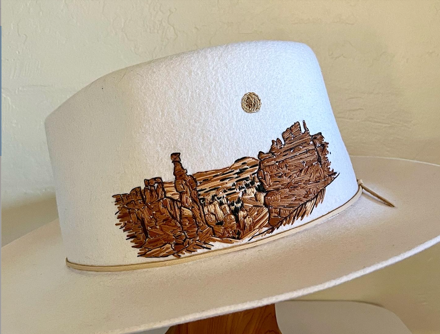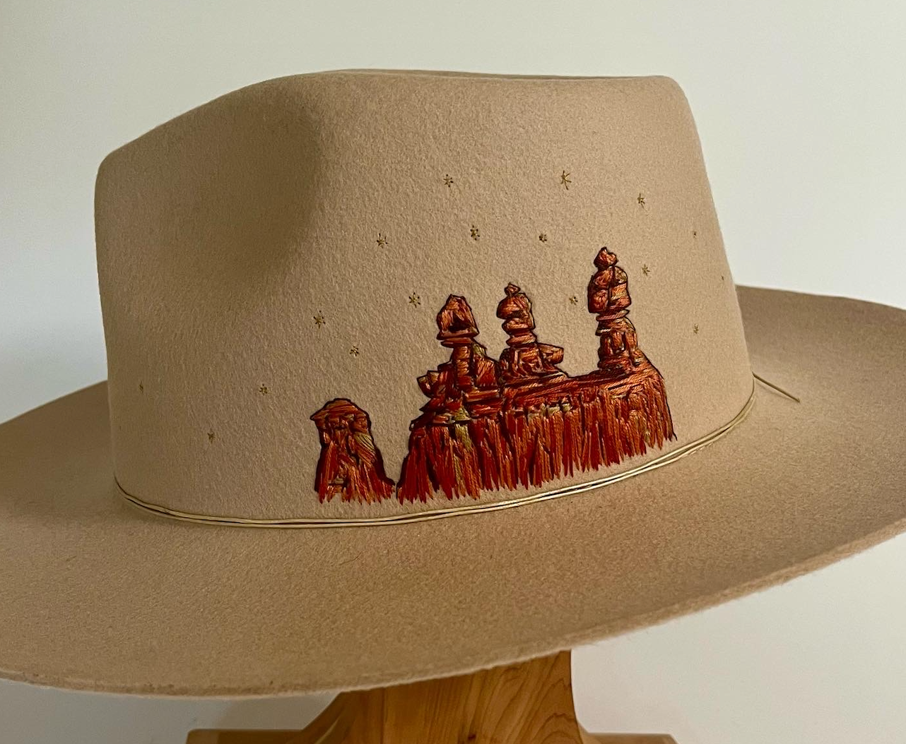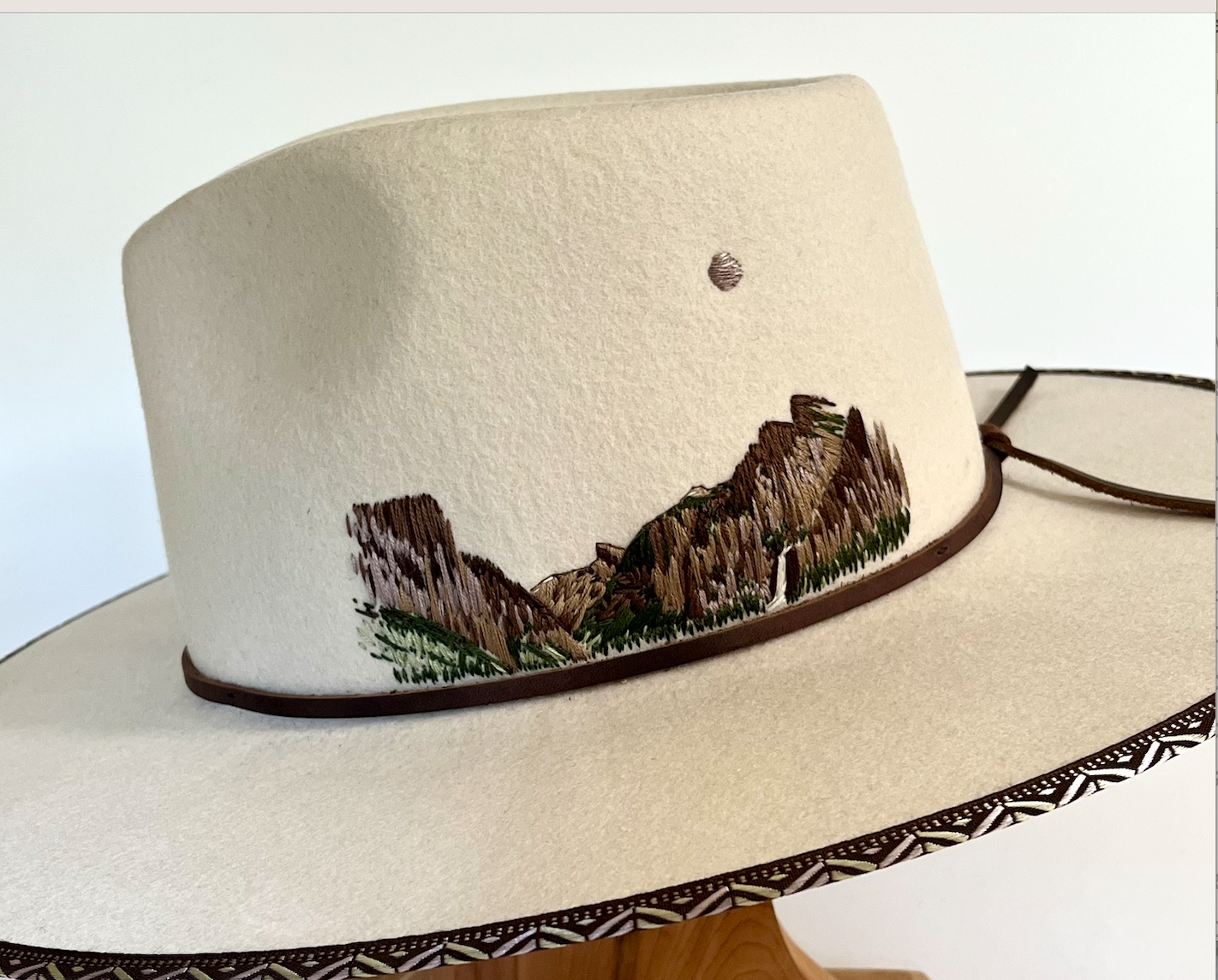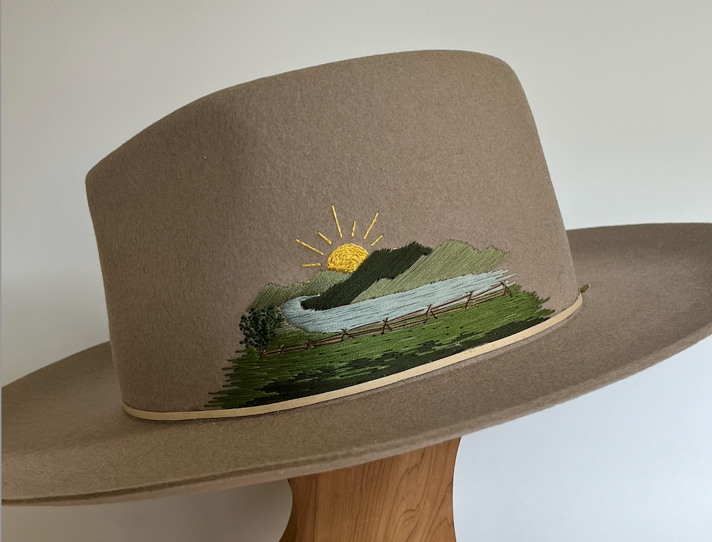 These landscapes are embroidered free hand directly onto the hat to both accurately depict the landscape requested by you and to evoke emotion through my technique and style.