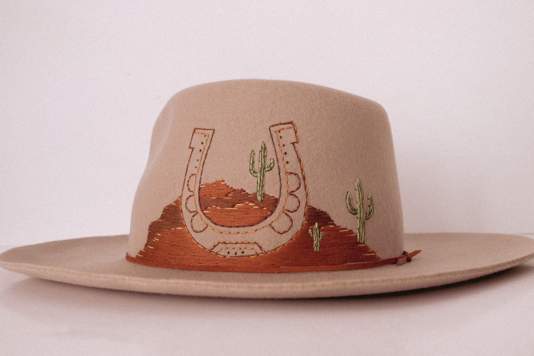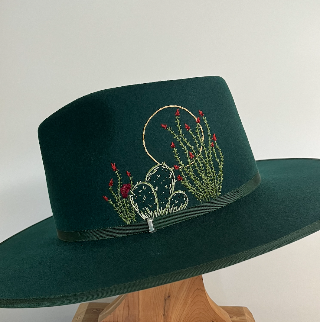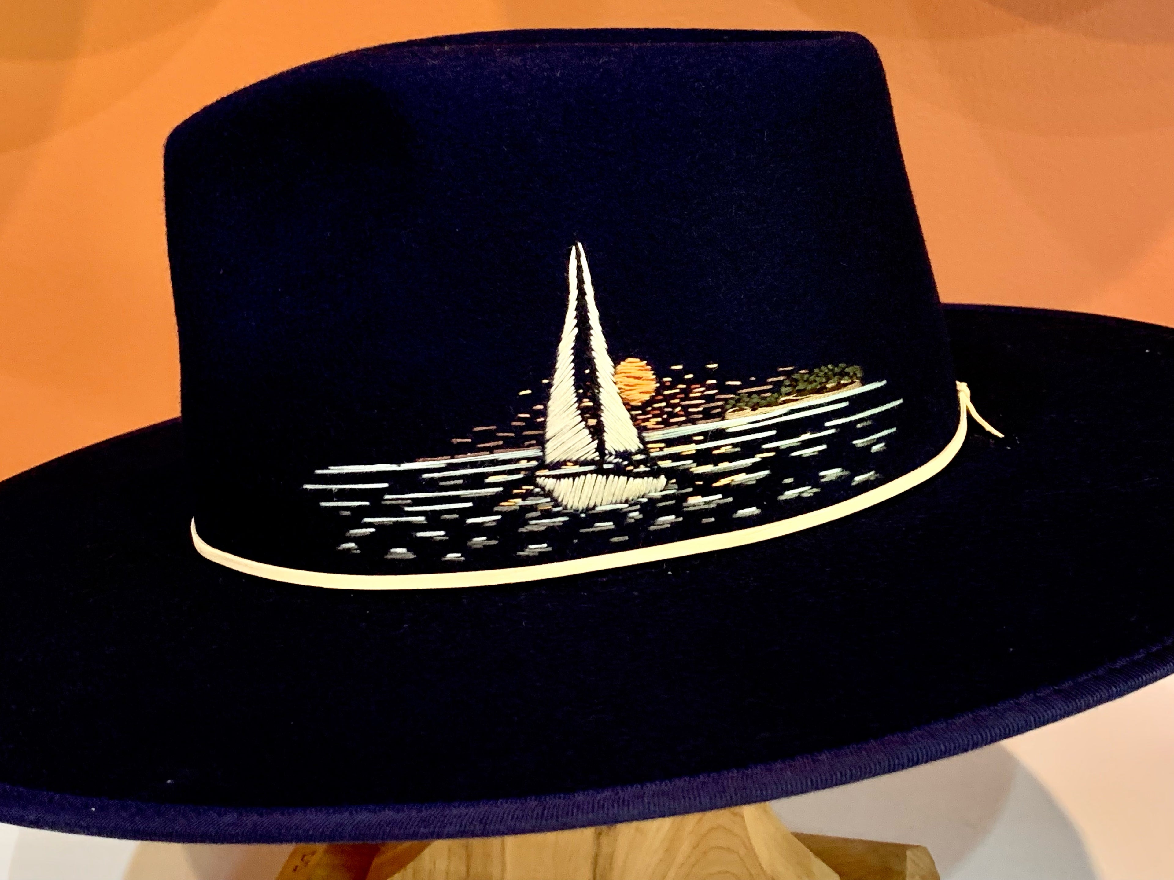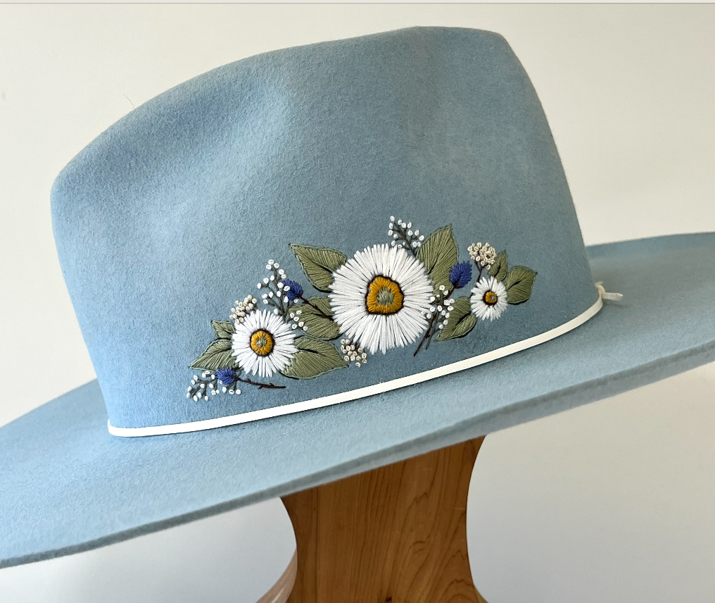 These landscapes are embroidered free hand directly onto the hat to both accurately depict the landscape requested by you and to evoke emotion through my technique and style.