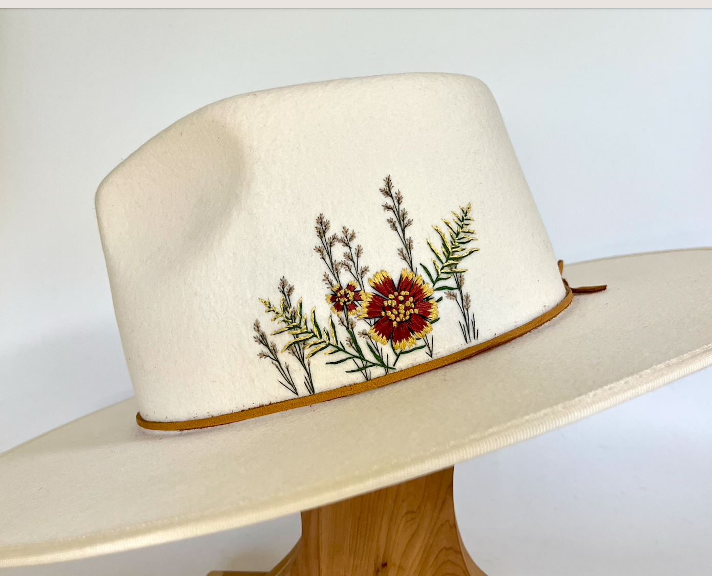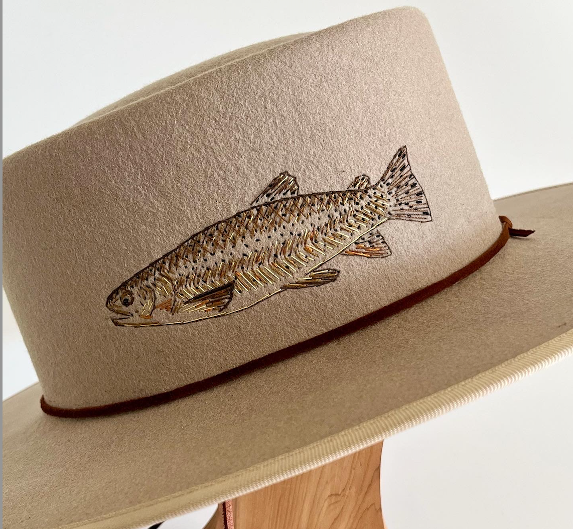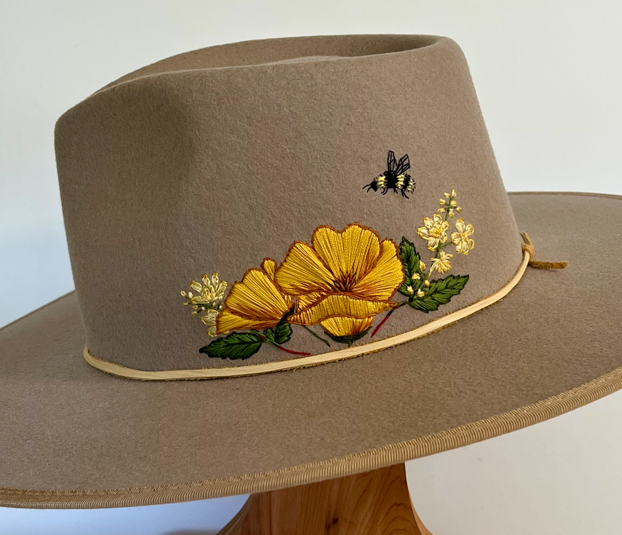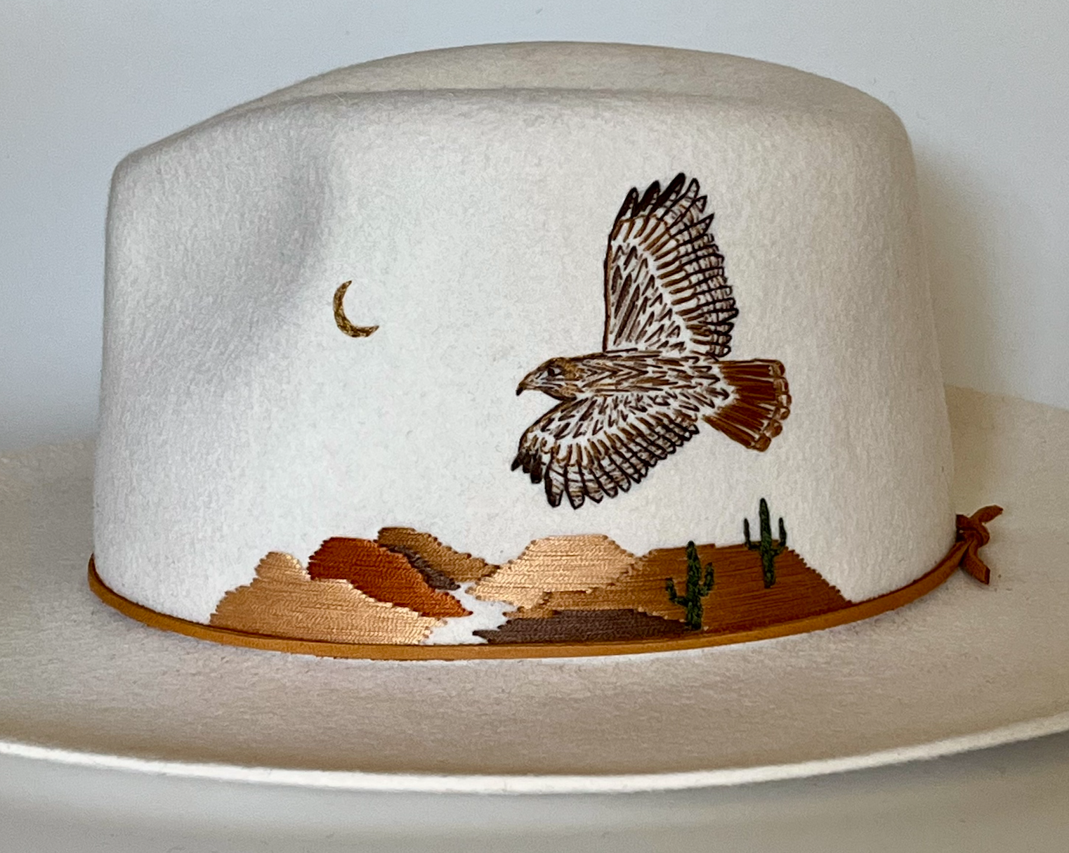 These landscapes are embroidered free hand directly onto the hat to both accurately depict the landscape requested by you and to evoke emotion through my technique and style.