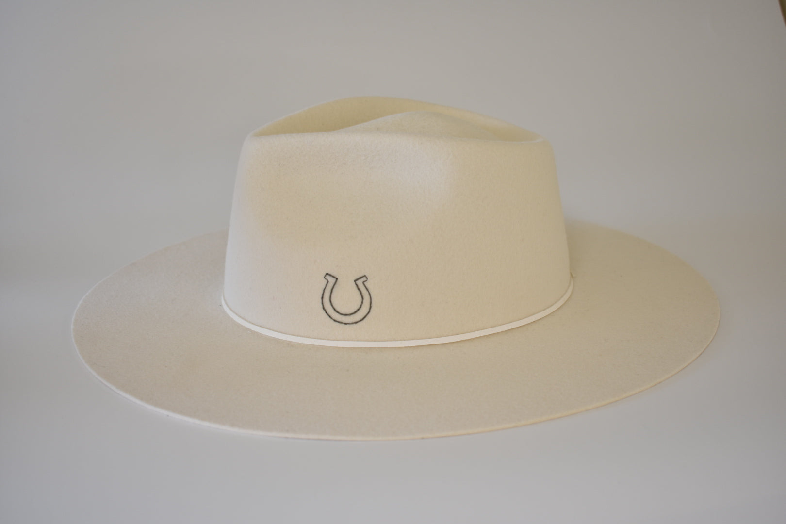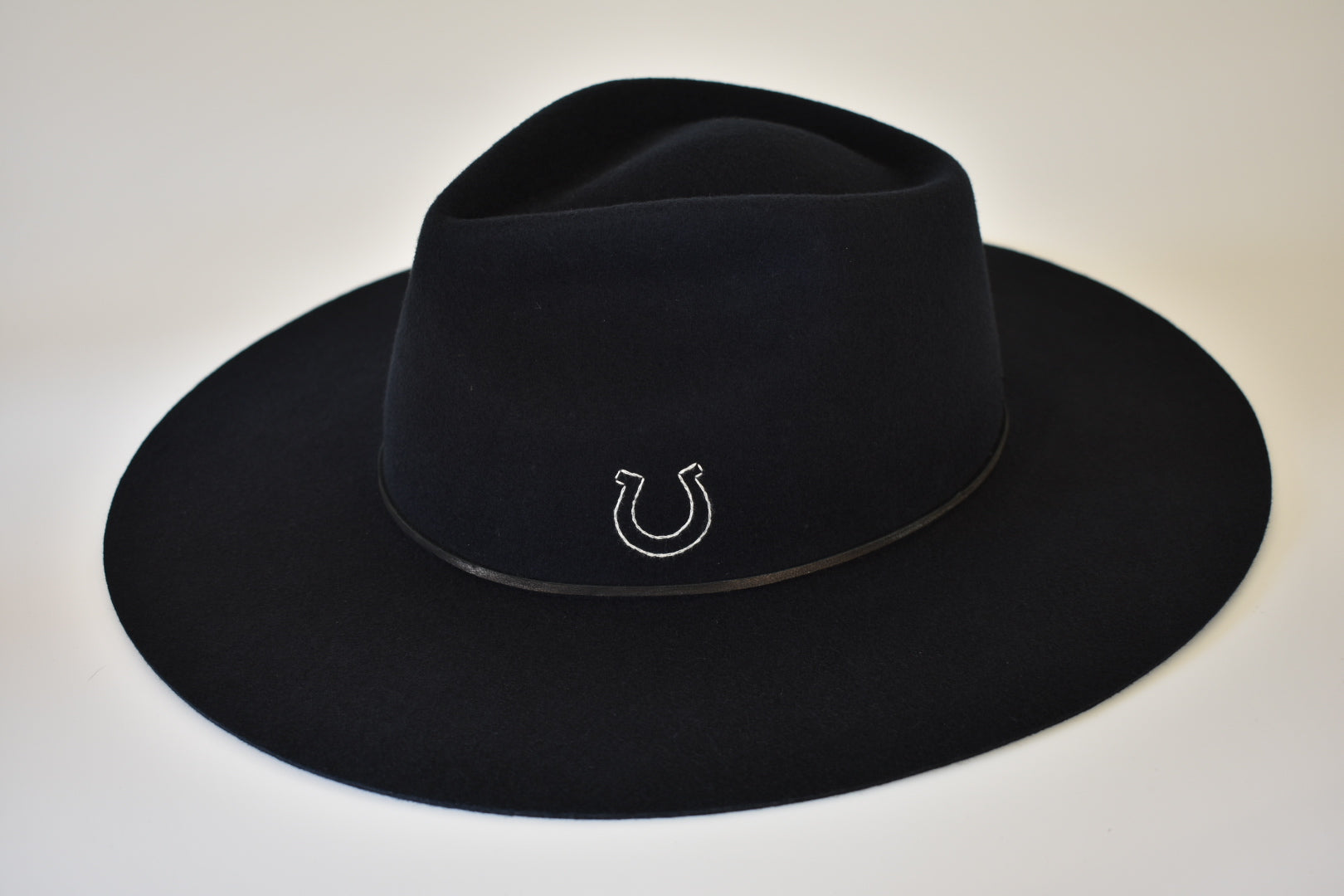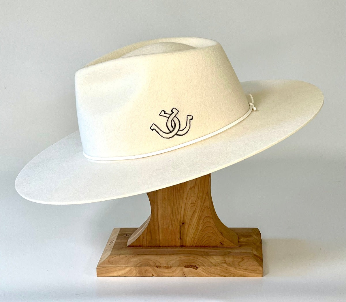 This hat is hand embroidered with a single or a double interlocking horseshoes design.