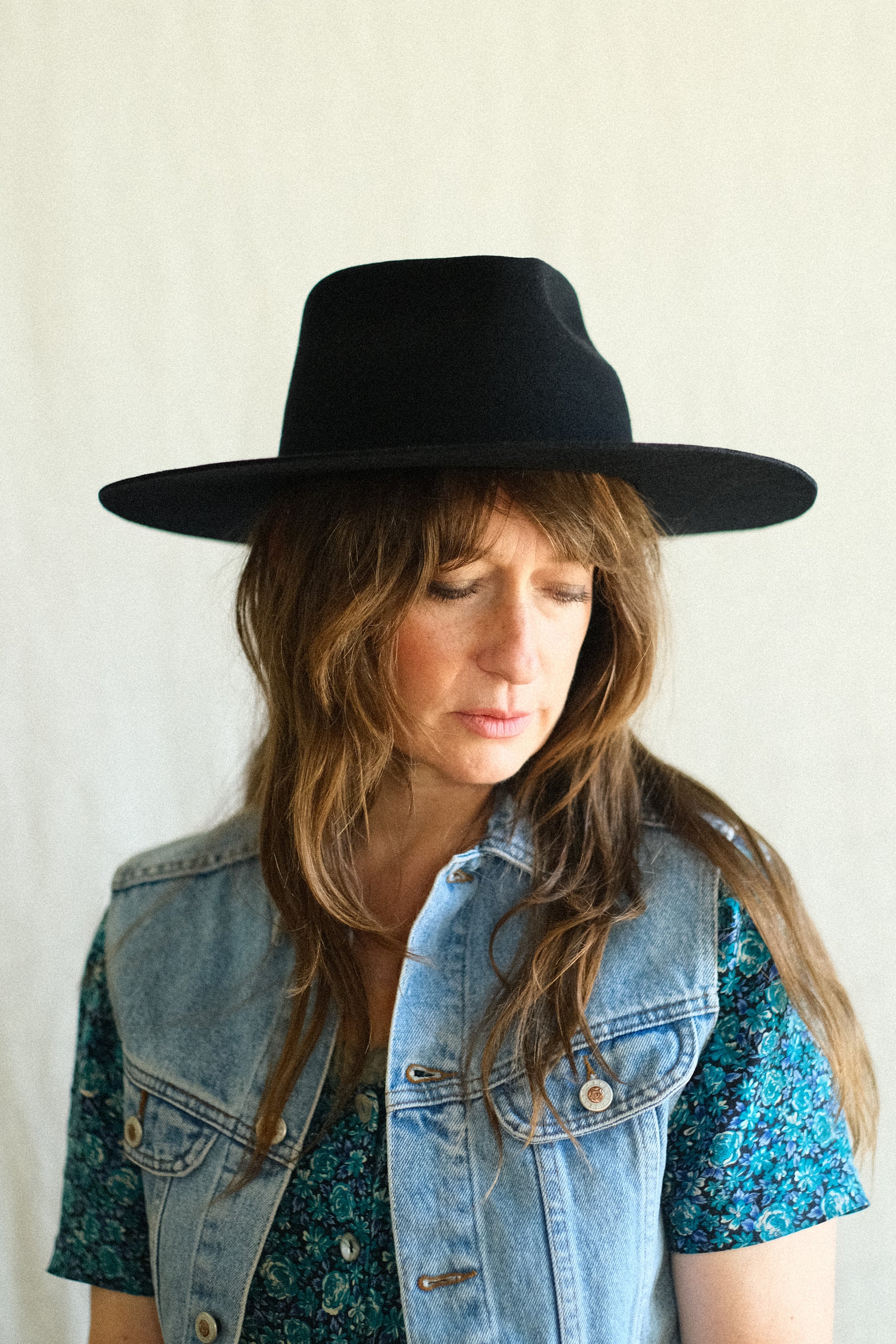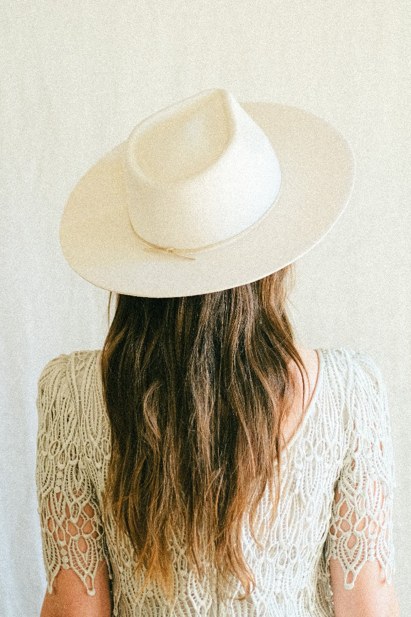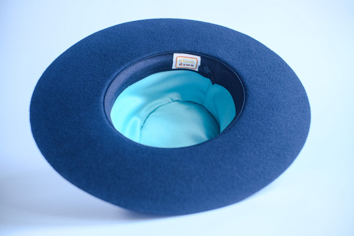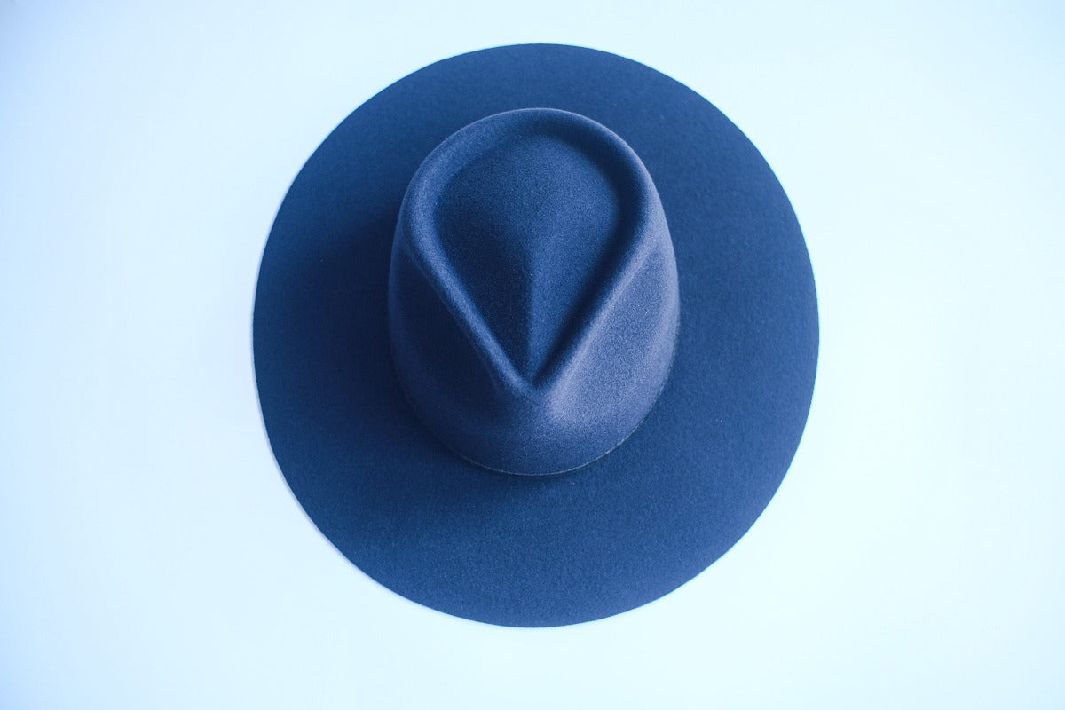 The first hat designed by Diana Dawn, the Ellis has a modern shape with subtle western detailing. Featuring a pinched crown and flat wide brim with raw edge, it is a classic and timeless design that is ready to become many consumer's wardrobe staple hat.