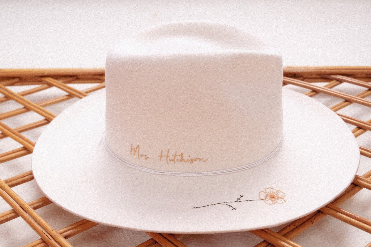 This bridal embroidery design features a floral arrangement of a variety of flowers and greenery as well as a flower on the brim and a name embroidered on the opposite side of the crown.