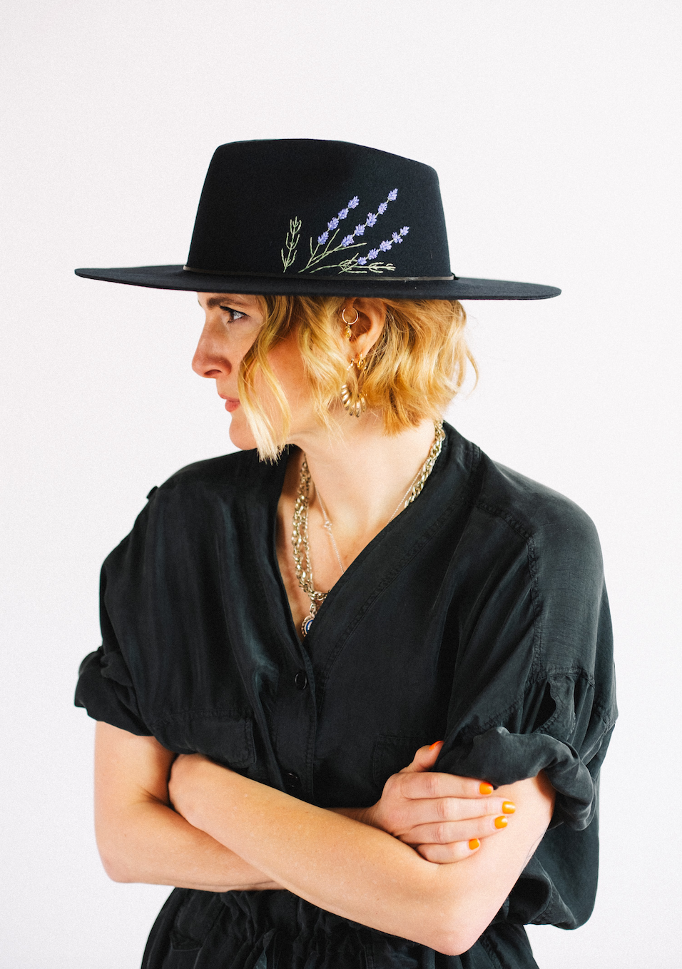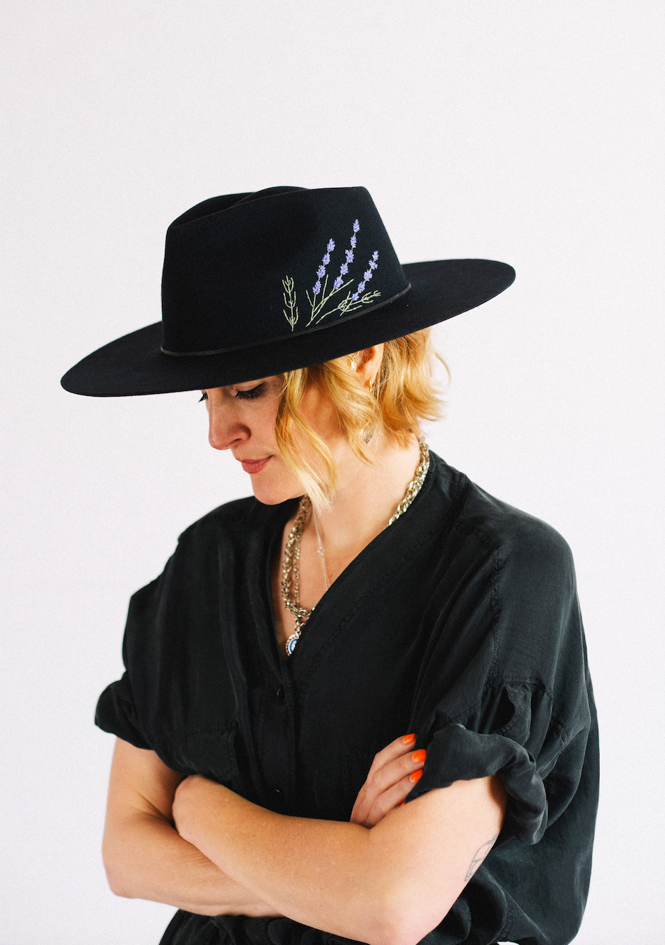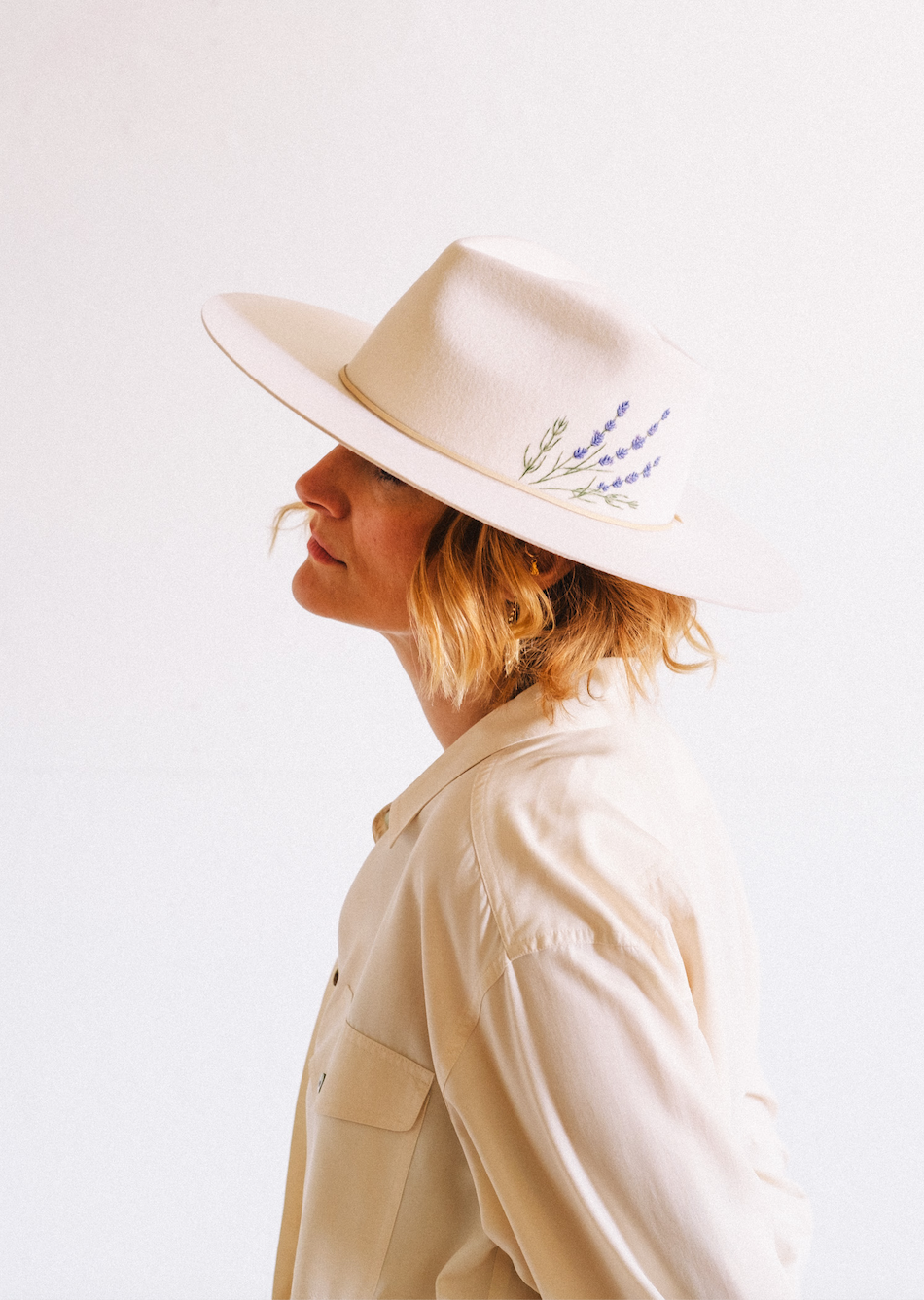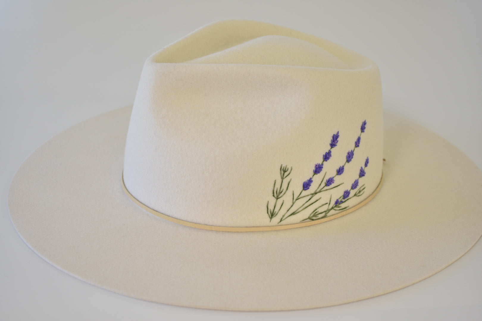 Each of these hats is hand embroidered with beautifully detailed lavender sprigs.