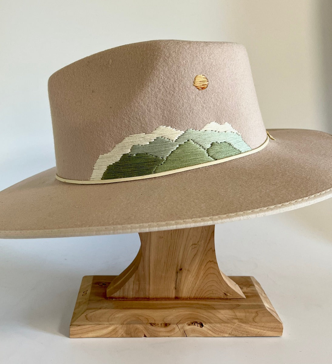 This hat is ready to ship! It is hand embroidered with a landscape in shades of sage green and has a gradient sun in the pink and orange colors of sunset.