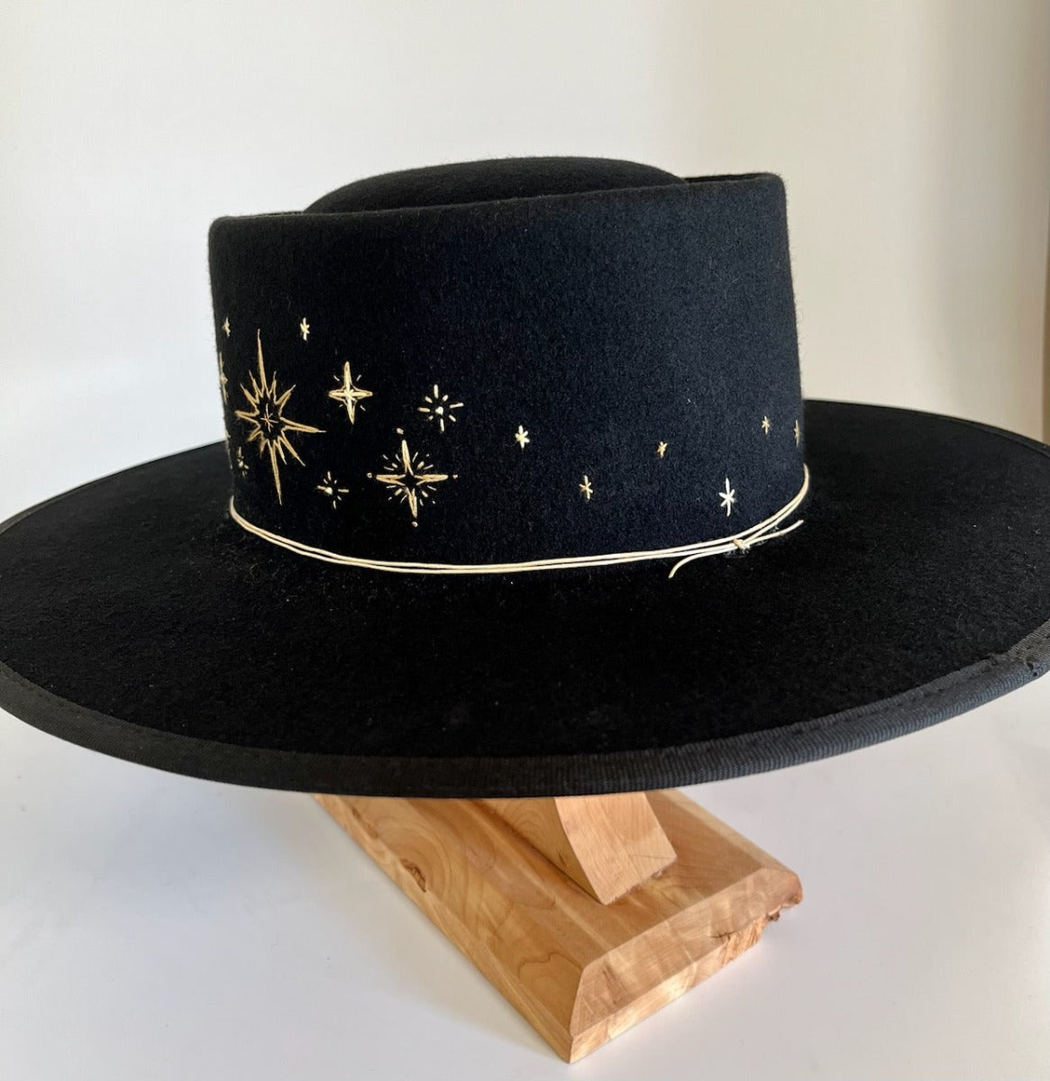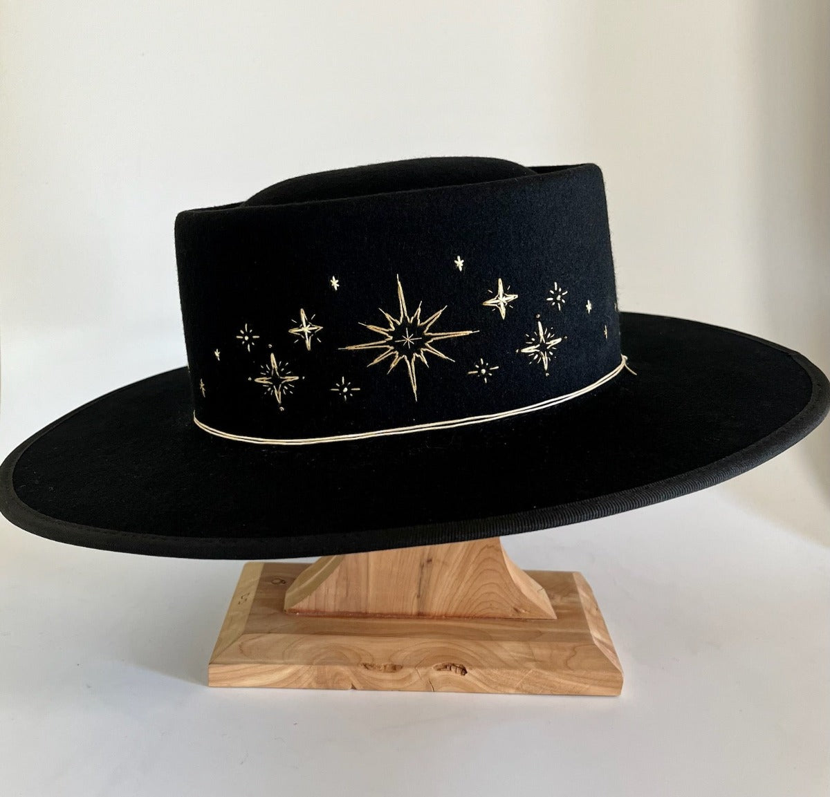 The hand embroidered hat has a flat telescope crown, a wide brim of 3.5", with a thin matching brim binding and a doubled light gold leather trim. There is a satin interior lining and an adjustable one-size-fits-most sweatband.